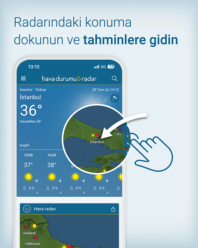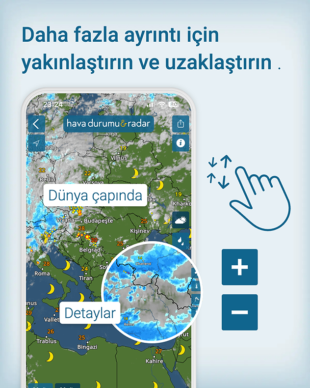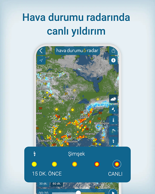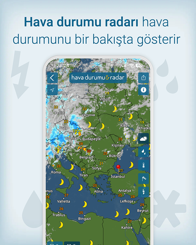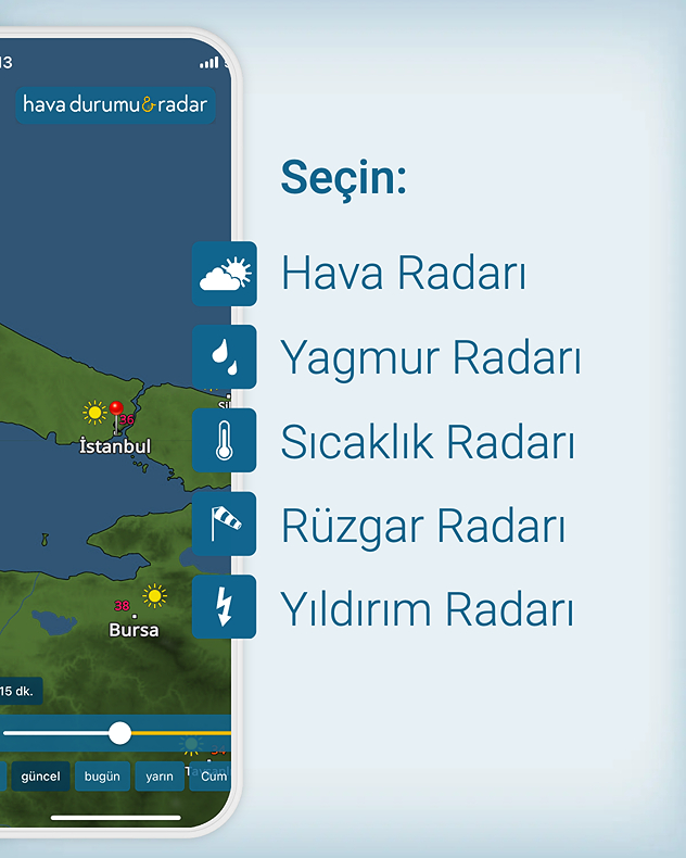 Daha ayrıntılı bilgi mi istiyorsun? Hava radarı üzerinden sadece tek bir dokunuşla özel radar türlerine ulaşabilirsin: YağmurRadar, RüzgarRadar, SıcaklıkRadar ve YıldırımRadarı.