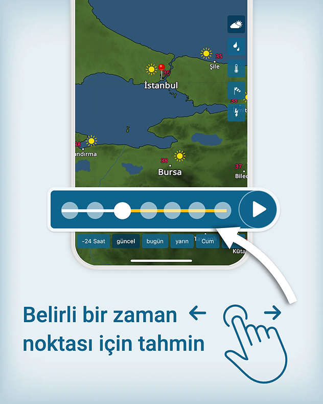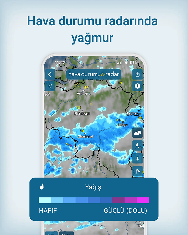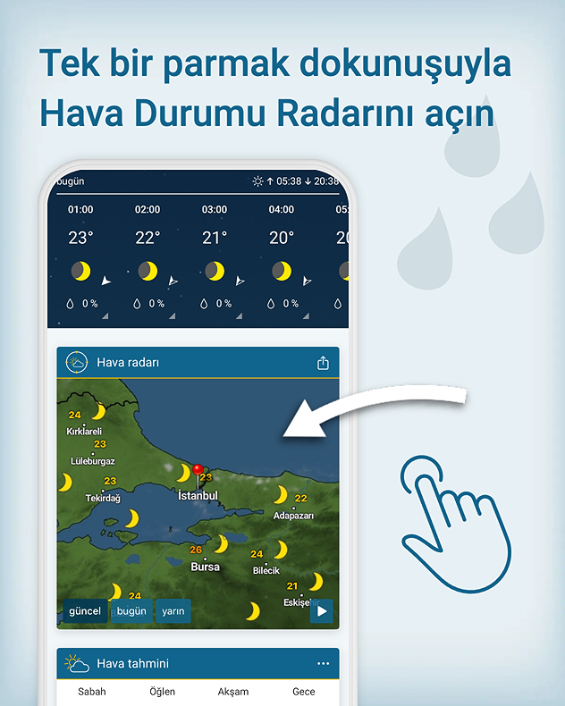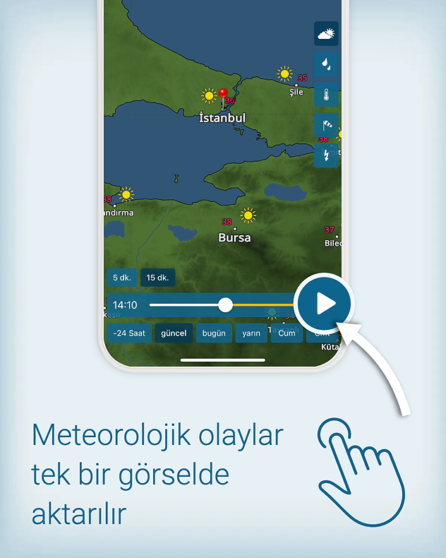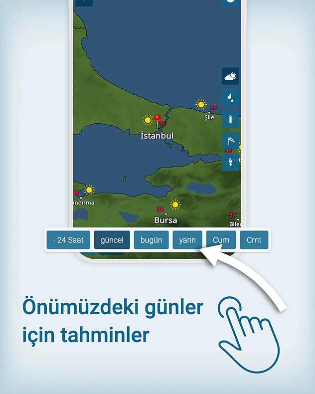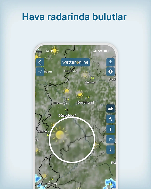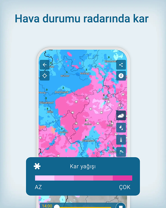 Hava radarı sayesinde gökyüzünde şu anda neler olup bittiğini her an canlı olarak takip edebilirsin. Seçilebilir tahmin zaman aralıkları sayesinde yakın ve uzak hava durumu senaryolarına göz atman mümkün. Bu da sana örneğin öğleden sonra şemsiye alıp almayacağına ya da yarın göle yüzmeye gidip gidemeyeceğine karar verme konusunda yardımcı olur.