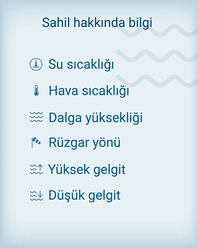 Sahil ve yüzme hava durumu özelliği sayesinde su ve hava sıcaklığının yanı sıra rüzgar hızı ve yönü, dalga boyu ve gelgit bilgilerine de kolayca ulaşabilirsin. Bulunduğun konuma göre en yakın plaj ya da göl için tüm bu bilgiler ekranda seni bekliyor.